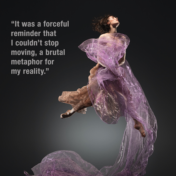 I used to skip rehearsals in the warmer months to go outside and dance on my own. I’d simply walk out of the building, no shoes on, because I needed to feel myself connected to something more sure and stable than the Marley floor that drowned me with the cooperating downward push of its partnering wall of mirrors. I’d go out and dance in my bare feet in soft, cool grass, and then on hot asphalt. I liked how I could move my feet quickly enough to only feel the sear for a moment before I pushed away and landed on somewhere that tricked my feet into thinking it was cooler until it burned again. It was a forceful reminder that I couldn’t stop moving, a brutal metaphor for my reality.