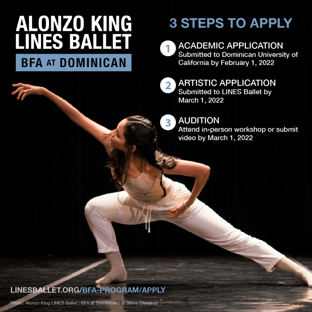 Our four-year Bachelor of Fine Arts degree program combines the acclaimed training and philosophy of LINES Ballet with Dominican’s comprehensive liberal arts education and social values. To apply, all applicants must submit a dance application to Alonzo King LINES Ballet | BFA Program as well as an Academic Application to Dominican University of California.